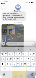 I got home Saturday evening at 8:30 pm and discovered I had missed a text about a lost ring. I immediately called to get the full story. Samantha stated that she had placed her rings and jewelry on her lap and forgot they were there. She, her husband and son stopped at a local McDonald’s; when she got out, forgetting about the rings, and inadvertently the rings fell off her lap and onto the pavement. She did not realize she had lost them until she got home about 80 miles away.