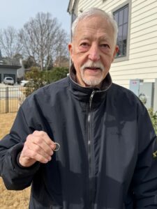 I brought out my detector and decided to start under the bush. I turned it on, made a few minor adjustments, and started to swing. I don’t think I swung the detector more than 4 or 5 seconds when I got a solid hit. I expected it to be a nail or some kind of garden spike, so I was genuinely surprised when I cleared away the top layer of mulch and exposed his ring. I think the ring came off when he was retrieving the ball, and when he went back to search for it, he inadvertently moved the black mulch just enough to cover it. David said he’d had the ring on his finger for more than 40 years, so he was extremely happy to get it back where it belonged. Another happy ending!