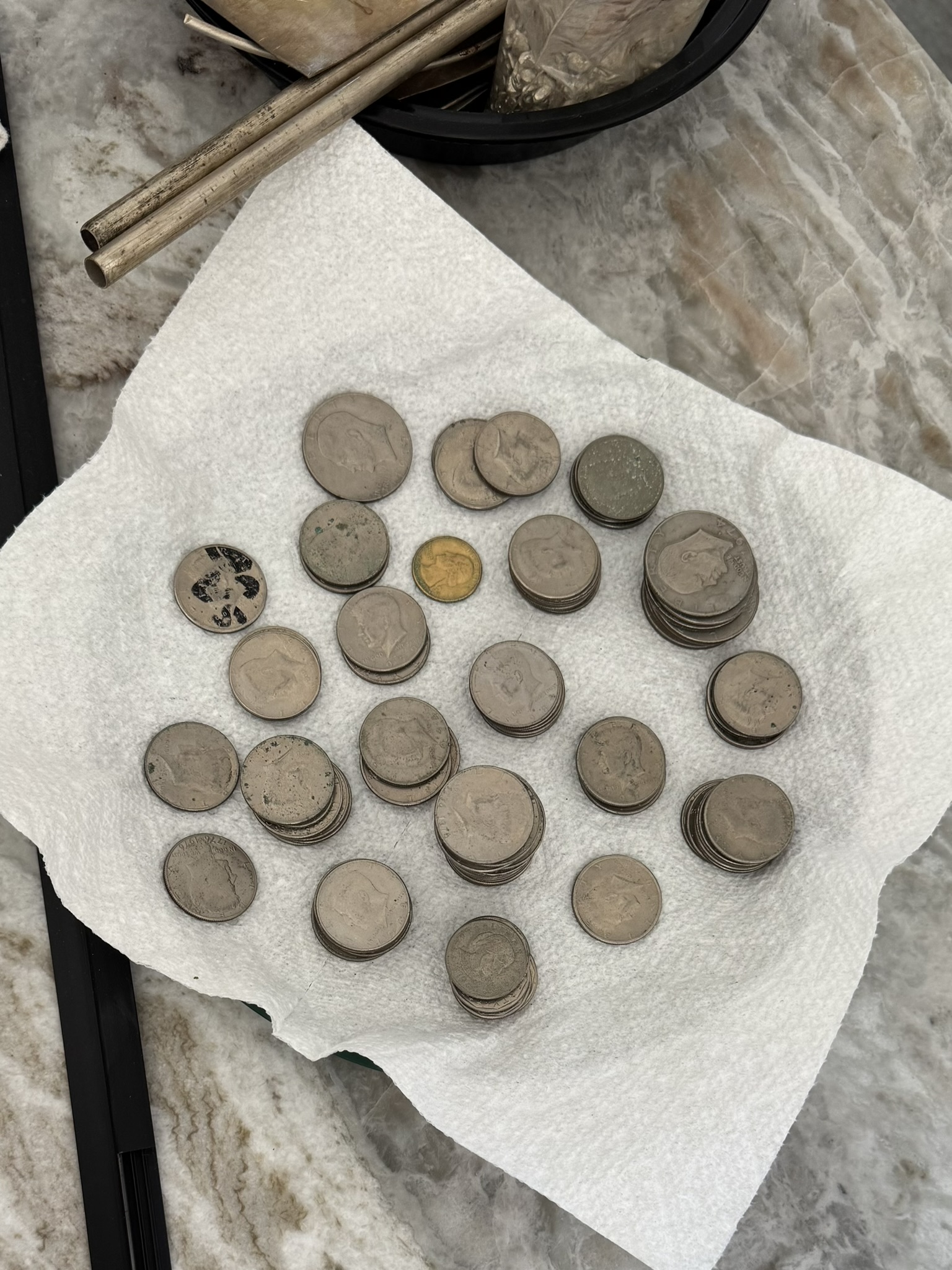 Got a call from out of state, to look for a buried box of silver and gold and family items. A father, with dementia, had buried his savings somewhere on their four acre plot of land a number of years ago. It was thought to have been buried in an old military amo box about 4 feet deep. They had been digging areas with an excavator and sifting the soil for weeks. They purchased a two box deep seeking metal detector to no avail. Thus the call. There was quite a distance involved, but the challenge and agreements made, I succumbed. I committed to a two day search all expenses paid expedition. Since it was believed to be in a amo box, I brought a Fisher M97, my XP Deus 1&2 and an amo box for readings. Using my 13 inch coil, a modified relic program, searching with the coil about 9 inches above the ground and a lot of luck, I had a good hit, but high numbers. I knew a amo box would be high. I used a 4 foot steel probe and felt the soil was easier to penetrate than surrounding soil and I hit something solid, but not metal. Bring in the excavator! At 85 I don’t dig four foot holes. Two scoops, first hole, success!!!  Box was plastic but high numbers were because of the silver coins and bullion he had collected. The one gold coin didn’t seem to have much affect on the readings. Father united with his savings.