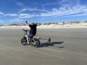 When I got there, I got to meet Sean and he gave me a quick lesson on the E-bike, I was excited!! He helped me strap my detector to the bike and I was ready to go. A short time later Meg came out and she was ready as well. Our trip down the beach to the mailbox was perfect and no walking or wrecks on the bike. We got to the start of the trail at 1:11 pm and I tested Meg’s other earring again to make sure I was getting the best signal I could. I took the equinox 800 through all the modes and found that Park 2 gave me the best signal and showed a 1 on the VDI (visual display indicator). The trail looked like it was a game trail that through time and use turned into a wider path with bushes, weeds, and sticker bushes on both sides. As we’re walking, I’m swinging from far left to far right in case the earring was flung off instead of dropping straight down. I was getting a lot of deep signals that were trash but no earring. We got to the “hot zone” where Meg had removed the poncho with no results and made our turn to go back. We got back in the hot zone and I hit a solid 1 with a great signal. Took my pin pointer out and ran it through the small soft sand area and didn’t hit the target. I took my hands and was scooping up small amounts of sand and out popped the earring, BINGO!! I picked it up and handed it back to Meg. What a very happy young lady.