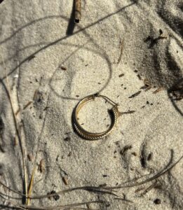 On Dec 19th, there was a post on a couple of the Sunset Beach NC Face Book pages from Aileen. The post said in part that her son’s (Sean) Girlfriend (Meg), had lost an earring that her mother had given her. That they had been walking on a Nature trail behind the *Kindred Spirit Mailbox, and she is pretty sure it happened when she took her poncho off. The last thing on the post was to contact Meg, via text, with a number. Aileen also attached a picture of the yellow gold earring. I checked the responses and saw that 3 or 4 people had already referred her to contact me and listed my contact information. So, I didn’t respond and waited to see if I’d get a call. *Kindred Spirit Mailbox is a famous, secluded mailbox on Bird Island, near Sunset Beach NC filled with journals where visitors write their innermost thoughts, secrets and dreams. The mailbox is listed as 1.5 miles from the last beach access on Sunset Beach. I’ve walked it a few times on searches and I honestly think it’s mismarked because it’s taken me close to an hour to get there.