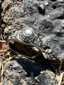 She gave me directions, and also sent me pictures from their time there to show me where to look. When I got there, I was able to line up on a couple of landmarks, and find where to begin. I began my grid in the darkness, making pass after pass finding a few pieces of trash metal. I made sure to work out of the box a bit in order to cover more ground just in case. I went over all the area she told me about, then began to work more toward the water. After about 6 more passes, and almost at the top of the slope, I got a real nice sound in the head phones. I dug, and had the ring. I sent a picture, and she confirmed it was the ring. She then asked if I could drive it to their home about 20 miles away through the Santa Monica Mountains which I agreed to do. When I got to the house she was not there, but her father was able to receive the ring, but did not want his picture taken, so you get me. Anyway, a great recovery, and return.