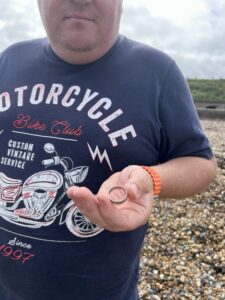 Cheryl and I arrived at Gooch’s Beach and the parking was horrendous. We drove around a few times and someone was finally pulling out. I parked in that spot but it was all the way on the opposite end of the beach, up near Lord’s Point. Once parked we walked down to the other end of the beach and Marguerite was there waiting and she recognized me. She told me Chris was walking down to the Private Beach area, to start looking again. As Marguerite, Cheryl and I started walking down the beach, Marguerite told us she had been wearing these extremely sentimental rings for almost 35 years. The rings were an Engagement Ring, Wedding Ring and a large special ring and she was heartbroken that she had lost them. Once we arrived at the log, Chris pointed out the area where they had searched and I could see all the areas, where the sand had been dug through. Both Chris and Marguerite thought the rings had been pulled out towards the water but I told them I didn’t believe that would be the case. I turned my metal detector on and asked Marguerite where she had been sitting. She pointed out the location and as I put the detector, to the sand, I received a loud signal and I could see two different non ferrous targets, on my screen. One registering a 28 and the other a 34. I hadn’t even swung the metal detector and I have received two very promising targets. Could this be real? Did I just find two of Marguerite’s very special rings, without even swinging my detector? WOW! I took my pinpointer out and located one of the targets, a gold ring, with rectangular diamonds, all the way around. Marguerite immediately let out a shriek of happiness. I located the next target and I saw another gold ring, this one with what appeared to be a large emerald with a diamond, on each side. UNBELIEVABLE !!!! Marguerite and Chris were in disbelief and just beaming with optimism, that I would locate the third ring. This would be a large gold ring, with diamonds all around. As I stood up and started to swing the detector, I received another very loud low tone, ringing up as a 68 on the VDI screen. This could not be happening. Did I just find the thing ring with just a partial swing. I could see Marguerite very excited and once I located the target with the pinpointer, I started wiping sand off the top of it. All of a sudden, I saw a perfect circular piece of gold. Marguerite screamed out in happiness. I took a photo, just as it just laid ,in the sand. I then picked it up and put it on its side, took another photo and then passed it to Marguerite who at this point, must have thought she was in a dream. Convinced her rings had been pulled out to sea, only to have someone show up and find them, without fully swinging his metal detector. I mean, I myself was thinking this was a dream. Marguerite and Chris have been married for over 34 years and the thought of losing these exquisite rings was just gut wrenching to them. To see their faces go from anguish to joy, in a matter of seconds is something so special to witness. Cheryl and I were just so happy for Marguerite and Chris, that they wouldn’t have to take their flight, across the pond, to London, without these very, very special rings, that hold so many memories. These rings could never, ever be replaced because of all the memories they hold, for Marguerite and Chris. It’s such a great feeling to be able to help people like Marguerite and Chris, in their time of need. As I often say, every ring has a story and now these three rings have one heck of a story to tell, all the way Bain the UK.