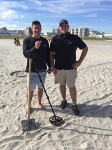 I gathered all the information I needed and headed down the beach. I asked Sean if he can grab a bunch of the white rocks in the sand to help line the bottom of the ocean floor as markers while I search and grid out the area. I decided to start from the deepest part and work my way to the shallows as the tide was on the rise! I did one pass around chest deep to over head and nothing. But, as I started to make my next line I got a loud “platinum” sound in the deeper part of the sandbar. I started to dig and fan all along looking and praying this is the lost ring. I then notice a ring, approximately 6” buried in the sand with the markings described of Megan’s ring, a big and thick Platnuim band with yellow gold that surrounding a diamond. I was sooooo excited to find it! As I grabbed it and looked up towards the beach where the entire family stood looking at myself and Sean, I held up her RING and Megan’s sister shouted… “I think he found it!” And the whole family was moved with emotions and tears as i can hear them excited and in awe. So, I handed Sean his wife’s lost but FOUND wedding ring. As Sean headed up the beach he met his wife in the yard and got on one knee to put back on her finger. The precious ring symbolized his love for her.