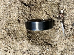 As Ryan started walking, I was right behind him. The waves were rushing up over the detectors coil and I knew we didn’t have much time. About a minute into the search, I received a target. The target was showing up on my screen as a ferrous target, so I didn’t dig it. Most likely a piece of a lobster trap or a bottle cap. We started back up searching and 3-4 minutes later, I received another target. This time it was a non ferrous target but it didn’t seem right. My detectors screen was telling me it was 7-9 inches deep and for being long for just 2 or 3 hours, the ring should not be that deep. The 38 on my screen was definitely in the tungsten range, so I dug the target. I always dig non ferrous targets, because you just never know. After a scoop of sand didn’t contain the target,bI dug another scoop of sand and dumped it to the side. Still no target. A third scoop and the target was out of the hole. I ran my fingers through the pile of wet sand and felt a ring. As I was pulling it out, Ryan saw it and said, “That’s it. That’s the Ring. You’re a lifesaver, you are incredible. Thank you “ No problem, I love doing this.