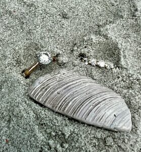 When I arrived, it took me a few minutes to park and then make my way out to the beach. Eric saw me and waved, so I made my way over to their spot. Eric explained that his wife had taken her rings off and put them on top of a bag. Eric moved the bag, along with some other items and the rings disappeared into the sand. He told me both rings were yellow gold. So I turned my detector on and knew I was looking for numbers on the detector in the 11 to 13 range. I checked where the bags were originally and its final resting place with no luck. I moved a couple of chairs under their umbrella and swung the coil. The first signal I got was an 11, so I knew I had the wedding band. I reached a little farther under the umbrella and got a 13, the engagement ring. I took a scoop of sand for the wedding band and then scooped up the engagement ring. I gently shook out the scoop and both rings were in the bottom of the scoop. Unfortunately, Eric’s wife, Liz was up in the room taking care of their 1 ½ year old. Day 1 of their vacation came to a happy ending.