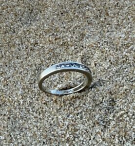 Frustrated and upset Katrina was sure it was lost forever. She was able to calm down enough to google “ How to find a ring at the beach” .. My contact information came up under The Ring Finders directory.  She didn’t call me until she was on her way home.