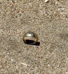 It all made perfect sense once I extracted the handsome band from below the dirt! I then realized where my obstacles existed in dealing with finding this piece of jewelry. First, my detector was incorrectly set at the time. Secondly, the ring was buried on a particular angle which made it more difficult to accurately assess the iron-like scratchiness sound that I was hearing in my headphones coming from the target. Thirdly, I wasn’t anticipating the possibility that the ring could have been fully pushed down into the ground where no metal was exposed at all! I learned a valuable lesson (even as a seasoned metal detectorist). Though I have had several searches where the item was recently lost and then found below the earth due to a shoe or foot that had pushed the jewelry down into the ground, I have at least been able to still see a slight “halo” of the ring peeking through. This particular search was definitely a first for me!