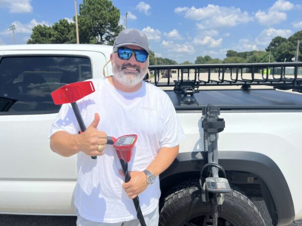 Sweeping the detector slowly and methodically, I worked through the grid David had indicated. Within moments, I got a strong signal. Carefully, I shoveled up the target with my XTREME Scoop, and through the mud and grass in the scoop, I could see David’s Aggie ring.