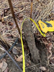 So, When I received a call from Michele to help find her bracelet, in York Harbor, Maine, I decided to give Deanna a call. Deanna was all for me returning and trying to find the fourth property pin, behind her neighbors home. After a successful recovery of Michele’s bracelet, I drove the 4.50 miles to Deanna’s house. The snow was gone, ground thawed and hay had been matted down, to a more manageable height. The property pin I was searching for would be exactly 85’, from property pin #3 Gary and I had found a little over 4 months ago. With my 300’ tape measure, I secured one end to Pin #3 and measured out the 85’. As you all know I am not a licensed surveyor and this pin had a degree of angle from pin #3 and I don’t have the tools to measure that angle exactly. I knew I could get close to it, but not exact. All this would mean is that my angle, over 85’ may put me off 5 or 10 feet from where the actual pin is. No prowl as I would just search the entire 10 feet or so of the area. Once I had the 85 feet measured out, I started to search. I received a strong ferrous target but it ended up being a piece of farm equipment. Another strong ferrous target turned out to be a very old and large square nail. Target #3 was something large. As I dug it up, it turned out to be a large chunk of concrete, WITH A METAL PIPE in it. This had to be the property marker. It was EXACTLY 85’ from pin #3. I also remembered from the property survey, there was at least one other pin that said “CONC. BND”. Concrete boundary? It appeared the pipe, running through the concrete and the concrete itself had broken. Just to be safe, I searched more area around the concrete pipe but nothing els was found. It had to be the pin, at exactly 85’. I took some photos and sent them to Deanna. Her response made perfect sense. She replied, “Likely got hit by the tractor mowing the field at some point. Great to have them all located, thank you!” Great point. The tractors had been cutting the hay in the field, for decades, if not longer. I am only guessing but because the ground is very wet, in that area, the property pin was placed in concrete, to keep it standing upright, until a tractor hit it anyways.
